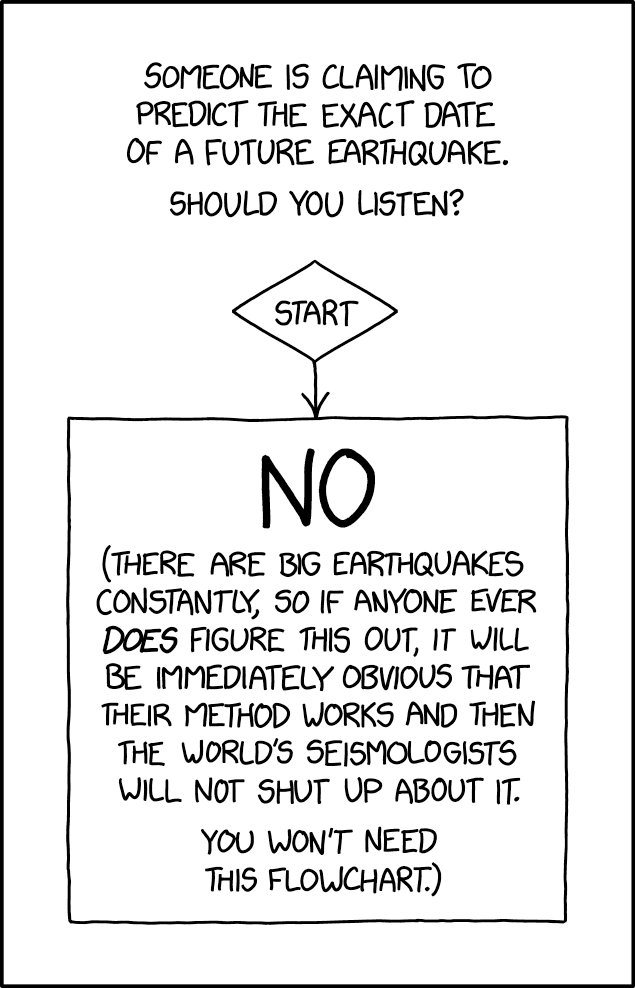 | 02:15, 8 November 2025 | earthquake prediction flowchart 2x.png (file) | 123 KB | TheusafBOT | == Summary == Small size can be found at https://imgs.xkcd.com/comics/earthquake_prediction_flowchart.png == Licensing == {{XKCD file}} | 1 | |