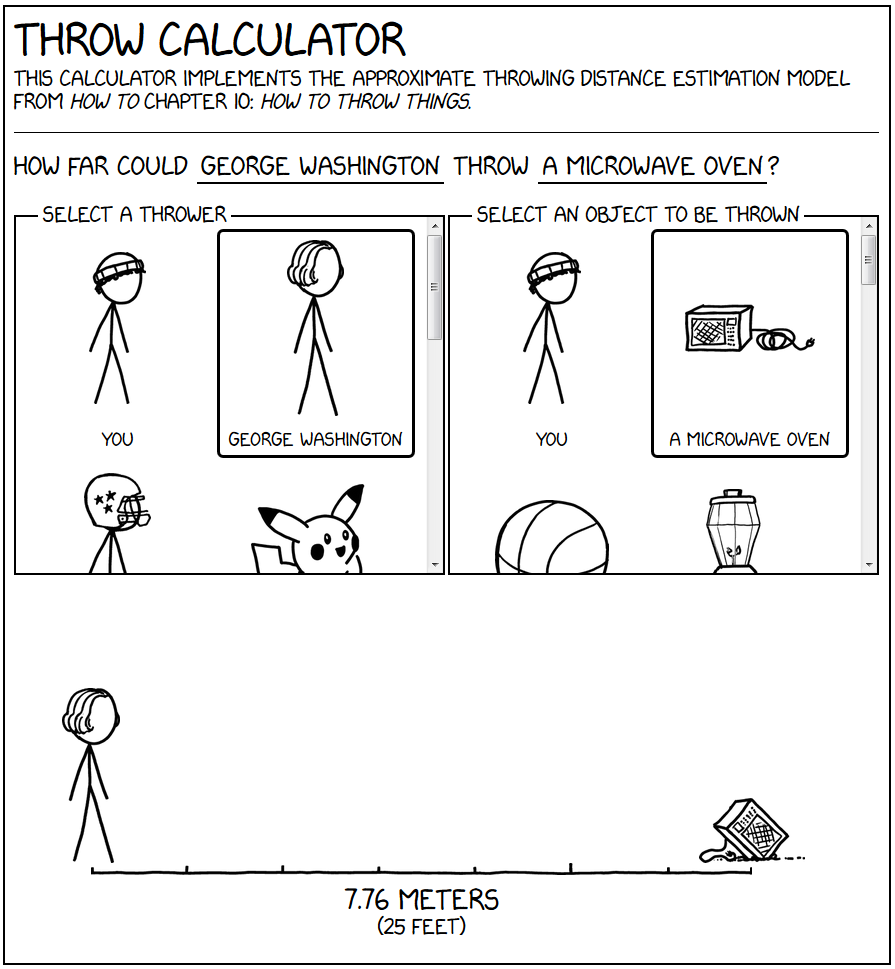 Screen capture, as it is an interactive comic. This is the screen shot coming up when the page is loaded. This is from after the error with George throwing George instead of the microwave oven. And it has yet again been updated after "You" was added in position 1 on both lists, pushing the NLF quaterback to nr 3 (thus keeping George in 2nd spot and preselected) and replacing Microwave oven in position 1, pushing that to no. 2 spot, although this is also preselected keeping the same throw with George throwing oven.
