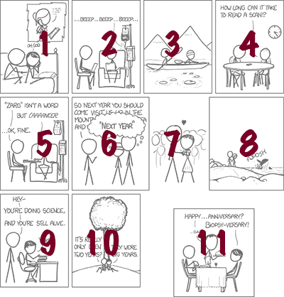 • Panel 11: Randall and his wife go out to dinner to celebrate the fact that she has made it two years since her biopsy. This turns awkward for Hairy, the waiter, since he had assumed it was an anniversary of their marriage.