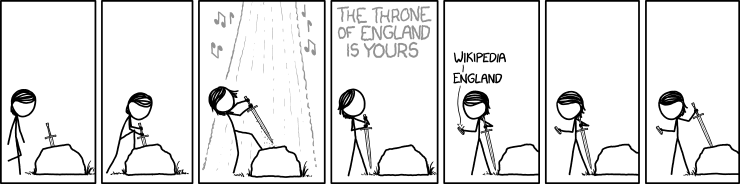 In this comic, Megan pulls a sword out of a stone. A flash of light comes down and music plays, and a heavenly voice tells her she has ascended to the throne of England. Megan then pulls out her phone and searches on Wikipedia for England. After having read for a while, she decides she does not want the throne of England and slowly places the sword back into the rock, without taking her eyes off the text.