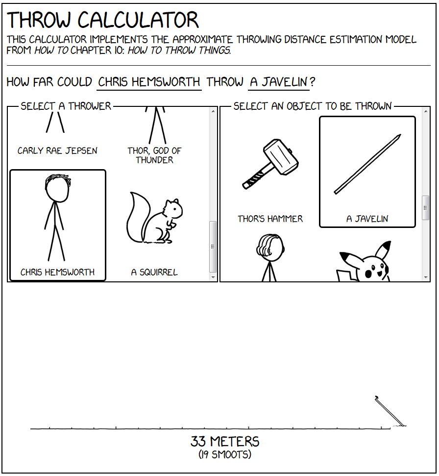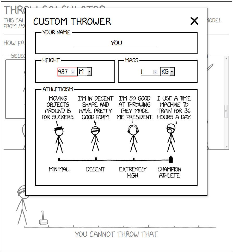 - When the You is customized to be giant, with as many digits in the "height" and "weight" options as possible, each thrown item goes to some maximum possible distance. Thor's hammer can be thrown the farthest, with a distance of 743079 meters; since the "range" that has been created for throwing is only around 471850 meters long, the longest hammer throw goes beyond the range, and instead of meter lengths showing where the hammer has fallen, there is nothing.