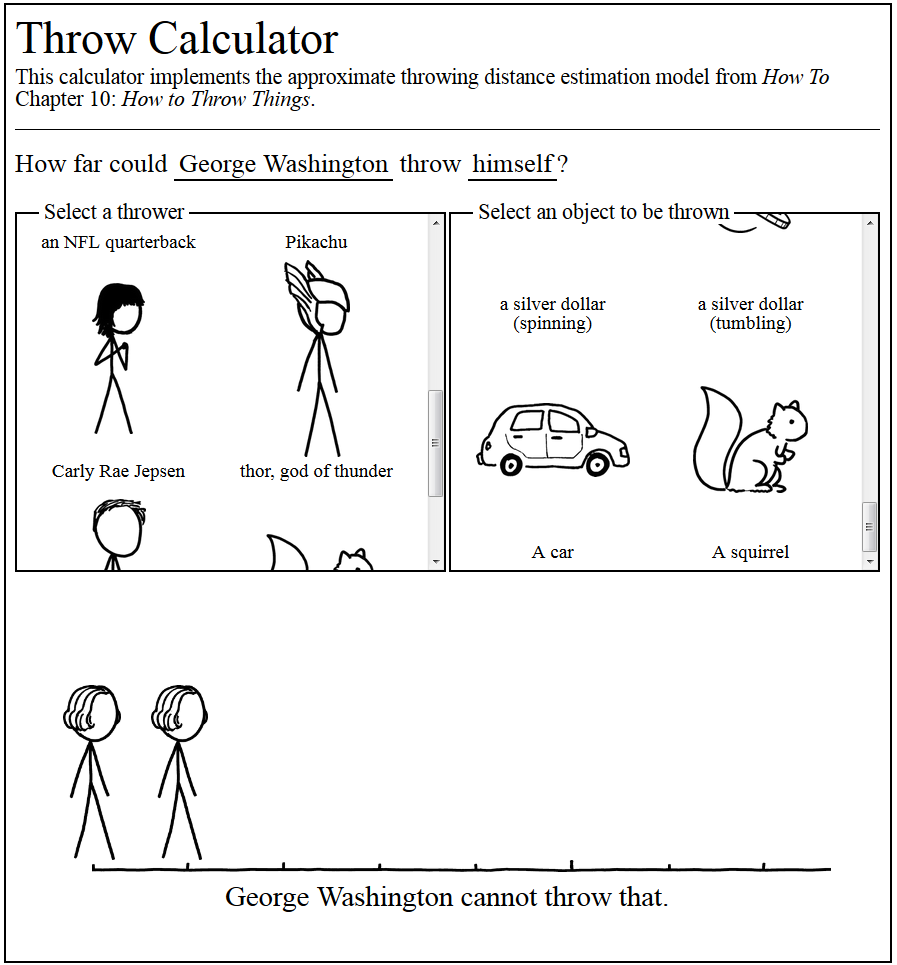 - In the beginning when the comic had just been released. There an error in the text above describing the throw. So it said How far could George Washington throw George Washington? instead of How far could George Washington throw a Microwave oven?.