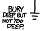 85×64 @ 481,682 | A ground connection, labeled "Bury deep, but not too deep". This type of ground connection is called an "earth ground" The "too deep" part might be a reference to Moria in Lord of Rings. The dwarves dug too deeply and disturbed a Balrog. See also comic 760: Moria. |