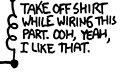 120×72 @ 537,847 | A coil or inductor, labeled "Take off shirt while wiring this part. Ooh, yeah, I like that." Stripping while wiring plays on the more mundane action of stripping a wire. |