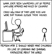 | 12:12, 4 August 2012 | cougars.png (file) | 24 KB | SlashBot | == Summary == XKCD Comic #999 == Licensing == {{XKCD file}} | 1 | |