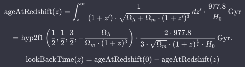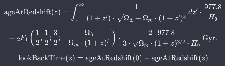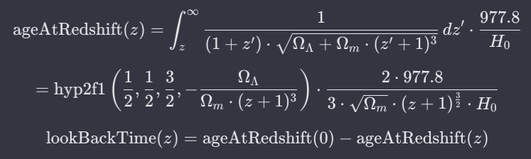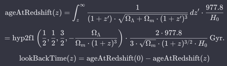 Equations for calculating the look-back time from redshift, for [[2853: Redshift]], by ChatGPT. See [[Talk:2853: Redshift#Calculation]]. | Equations for calculating the look-back time from redshift, for [[2853: Redshift]], by ChatGPT. See [[Talk:2853: Redshift#Calculation]]. | ||