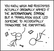 14:45, 16 January 2026 international station 2x.png (file) 70 KB TheusafBOT == Summary == Small size can be found at https://imgs.xkcd.com/comics/international_station.png == Licensing == {{XKCD file}} Category:Comic images 1